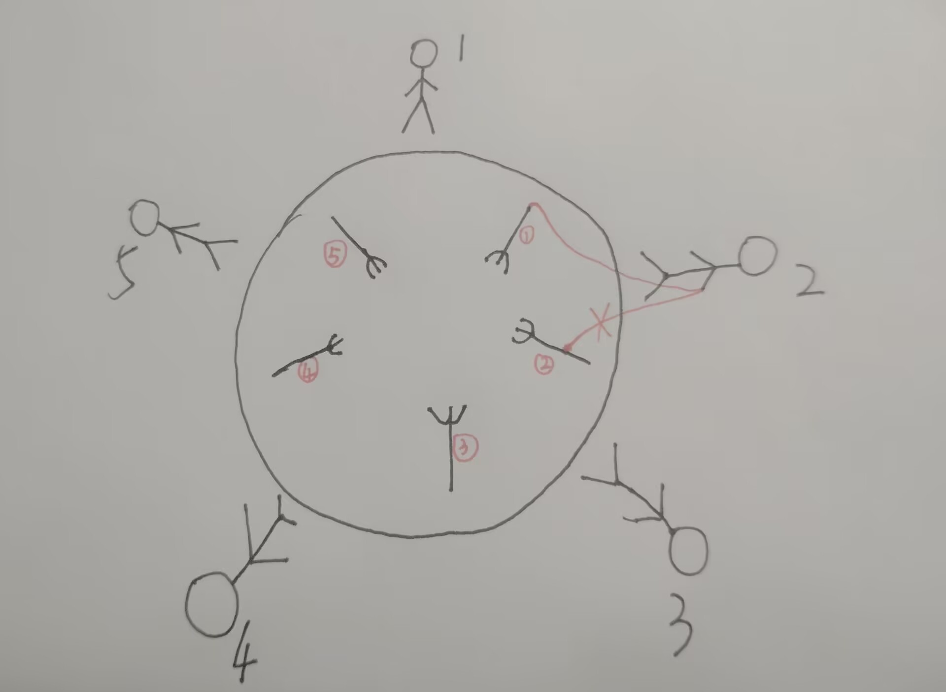 所有的哲学家都只会在思考和进餐两种行为间交替。哲学家只有同时拿到左边和右边的叉子才能吃到面,而同一根叉子在同一时间只能被一个哲学家使用。每个哲学家吃完面后都需要把叉子放回桌面以供其他哲学家吃面。只要条件允许,哲学家可以拿起左边或者右边的叉子,但在没有同时拿到左右叉子时不能进食。