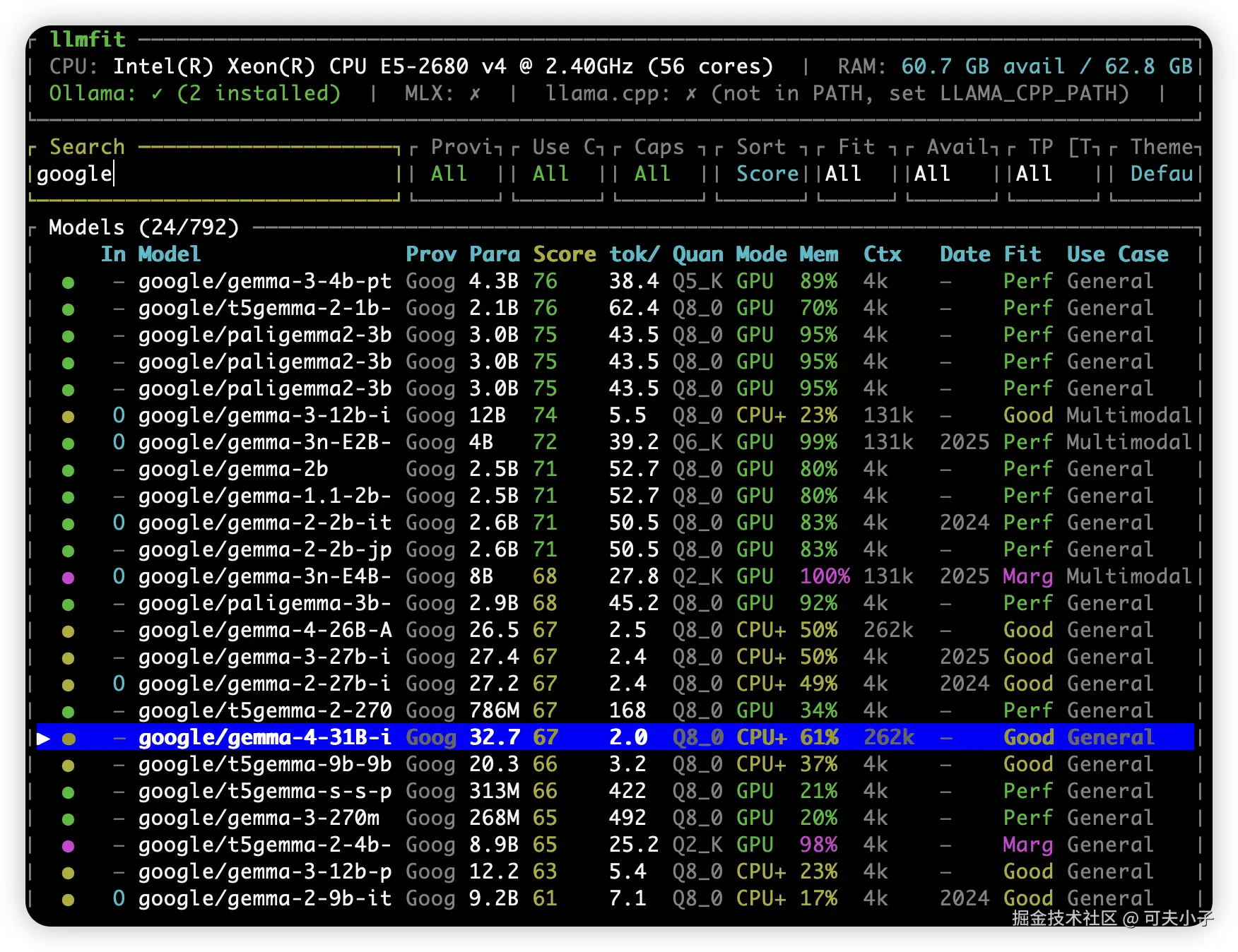 安装完成之后,输入 llmfit 启动检测,输入 / 然后再输入 google,就可以查看能跑 Gemma 4哪个模型合适?