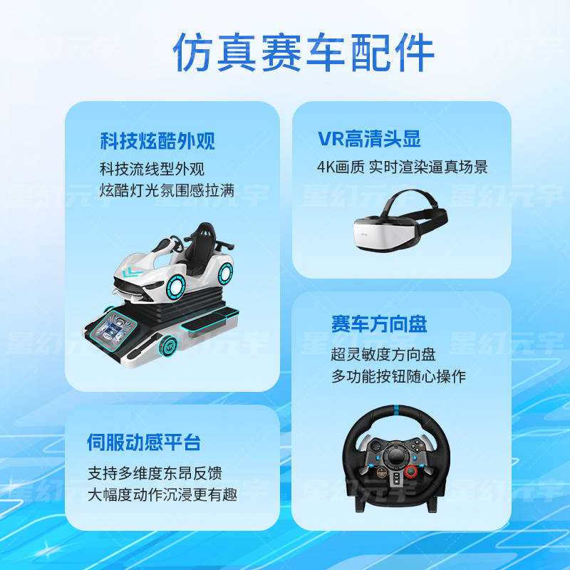 为了增强驾驶真实感,VR卡丁车通常配备实体座舱、方向盘、脚踏板、体感震动系统等。通过硬件联动,体验者在操作方向盘或踩刹车时,系统会实时反馈,例如: