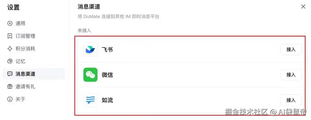 虽然它看起来极简,但该有的功能基本都有了 比如支持接入飞书、微信、如流等主流沟通工具,