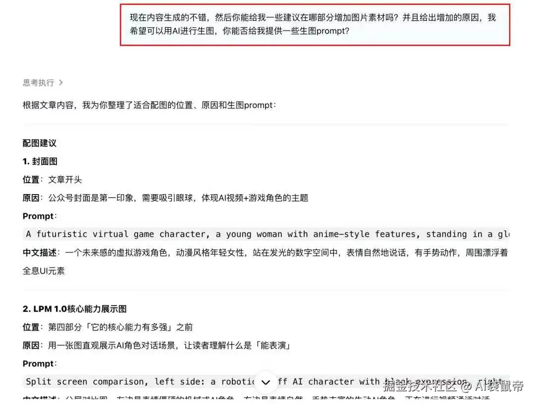 它给出了建设性的建议,比如在技术解析的部分加一张流程图,在结尾加一张充满未来感的氛围图。