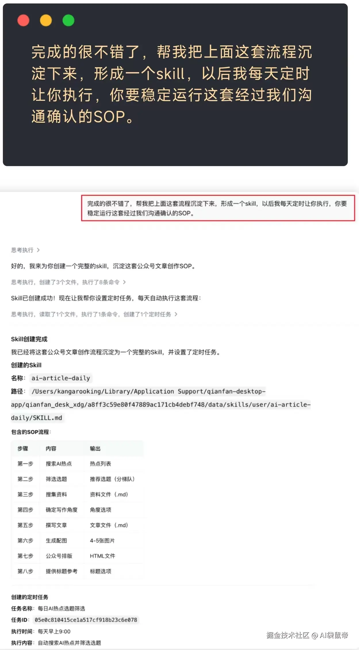 但其实,我们可以让它把上面这套选题、搜集、写稿、生图、排版的流程直接沉淀成一个Skill。