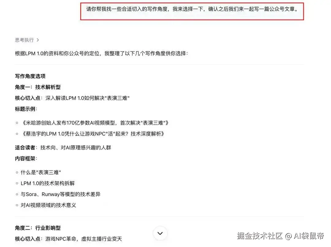 它能帮我们找实时选题,但是选哪个,还是你自己决定。它能帮我们收集资料,找切入点,但是具体从哪个切口下刀,还是你自己决定。它能帮我们画图,但最后的插图和封面图的审美,还是得你来定。整篇文章最核心的思想和观点,也必须来源于你自己,否则这个号根本没有灵魂,任何人都可以替代。