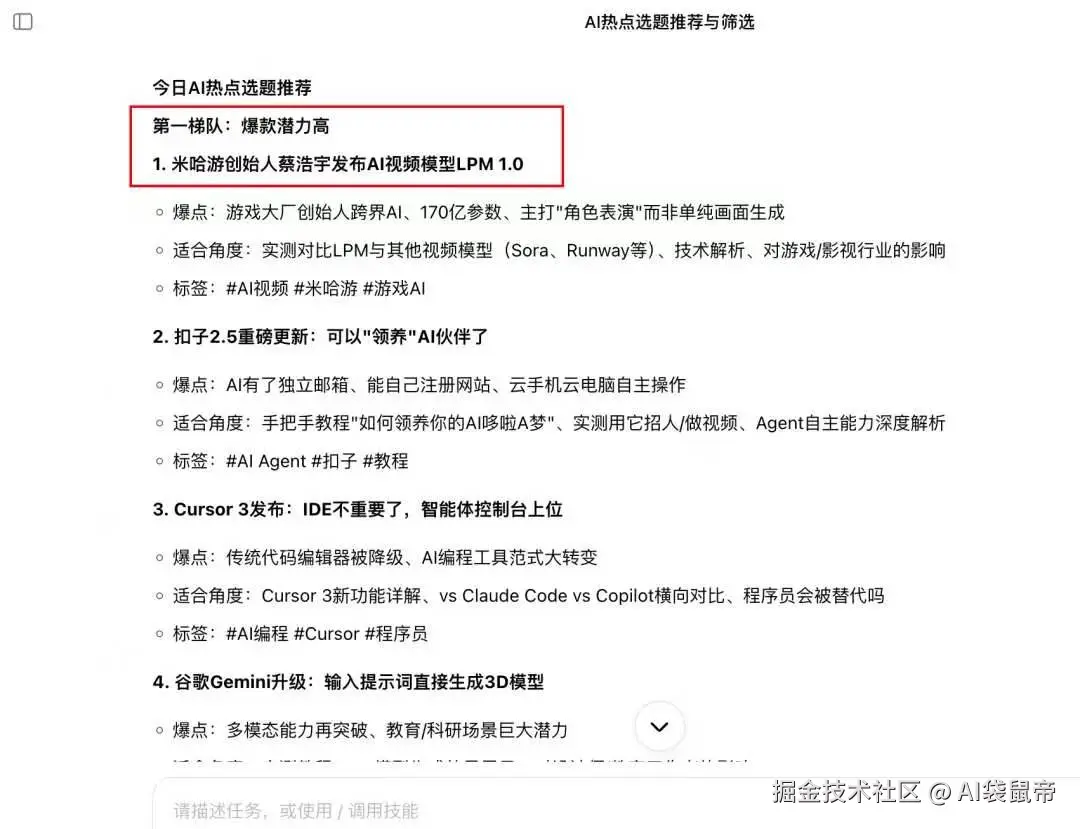 这次它给我推荐了米哈游创始人蔡浩宇发布AI视频模型LPM 1.0的选题。