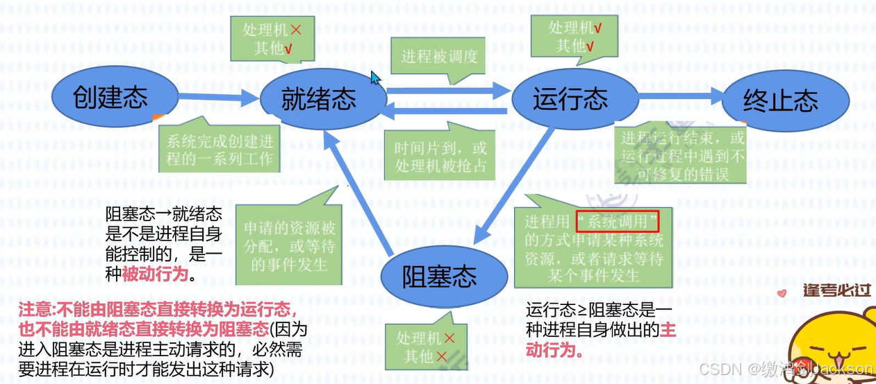 - 阻塞态:进程因等待某事件(如I/O完成、信号量)而暂时无法继续执行,主动放弃CPU。