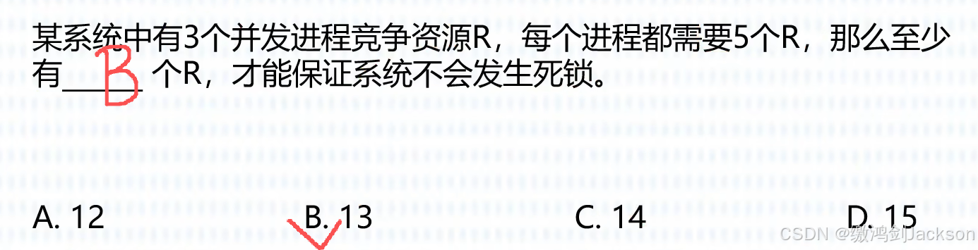 综上,故能确保不发生死锁的最小资源数是13(即发生死锁的最大资源数12 ,再加上1,即13),故本题选B。