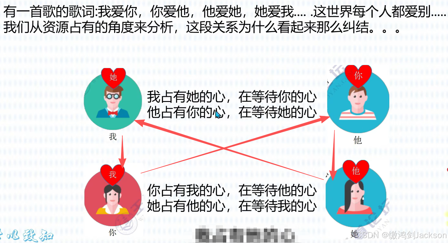如下图所示,在这场四角恋中,没有任何一对是彼此相爱,因此就陷入了死锁(谁也无法成对),这就叫死锁。