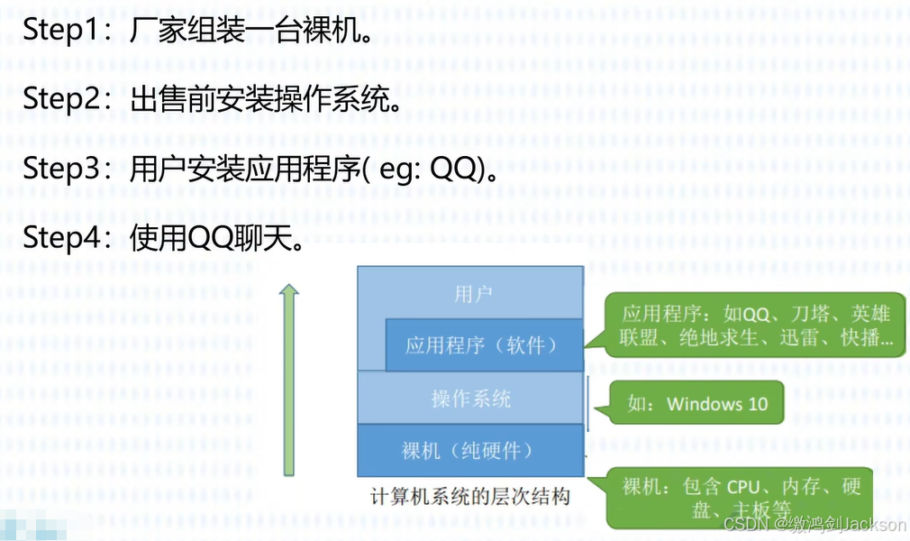 - 操作系统介于软件(应用程序)和硬件(裸机)之间