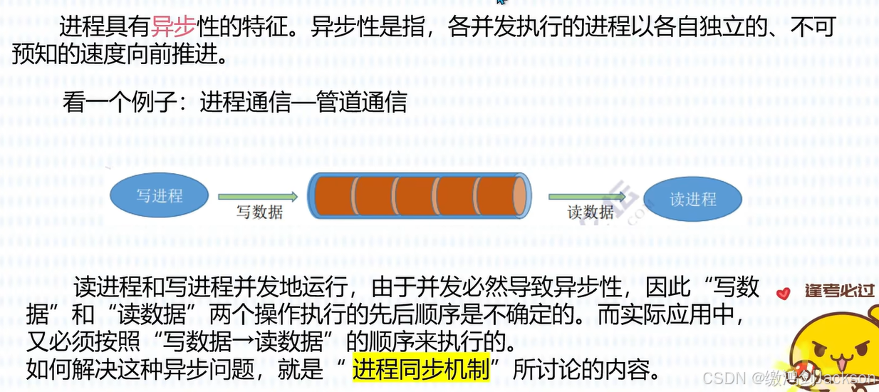 - 异步:操作系统中进程的执行具有不确定性,进程的执行顺序、速度和完成时间不可预知,需要通过同步机制来协调并发进程间的执行。