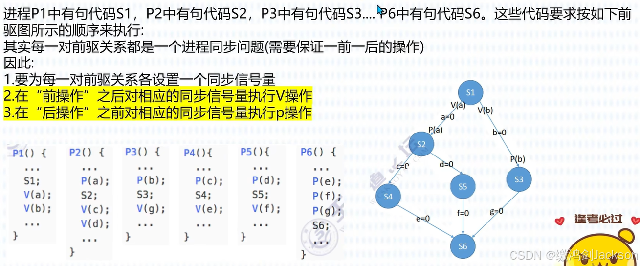 答案:其实很简单,因为P3的前驱进程(P1和P2)释放的信号量是S1和S2,而P3的后继进程(P4和P5)所需的信号量是S3和S4。