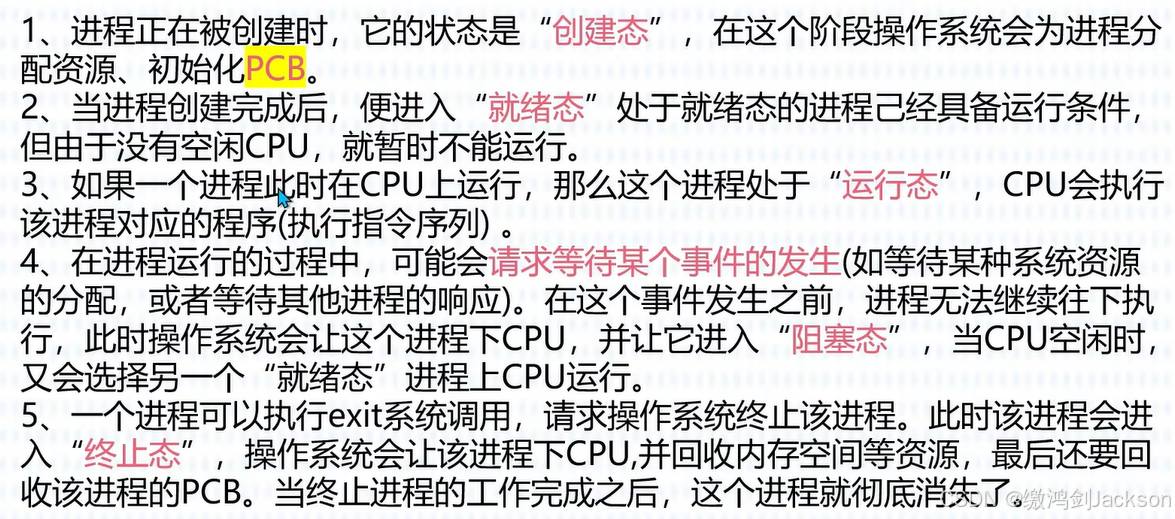 - 终止态:进程已完成执行或被强制结束,操作系统正在回收其占用的资源。