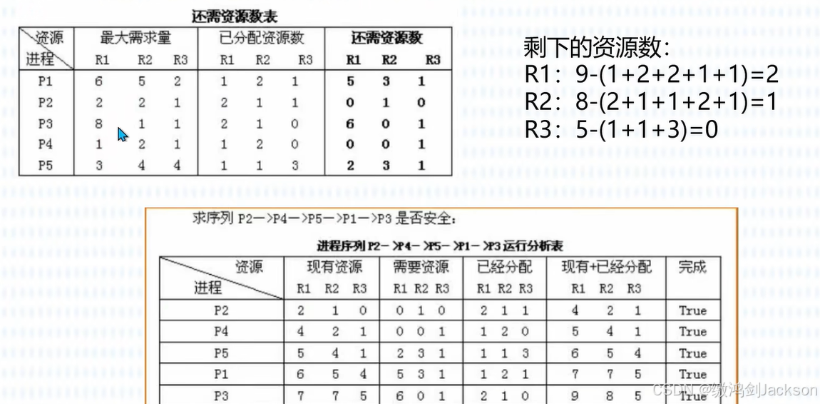 - 第二步:看满足哪个进程的"还需资源数",经过对比,只能满足进程P2的还需资源数。因此给它凑够了,让它去运行,运行完,就把所占的全部资源都释放了。因此进程P2执行完,当前的所剩资源数是R1=4 ,R2=2,R3=1。