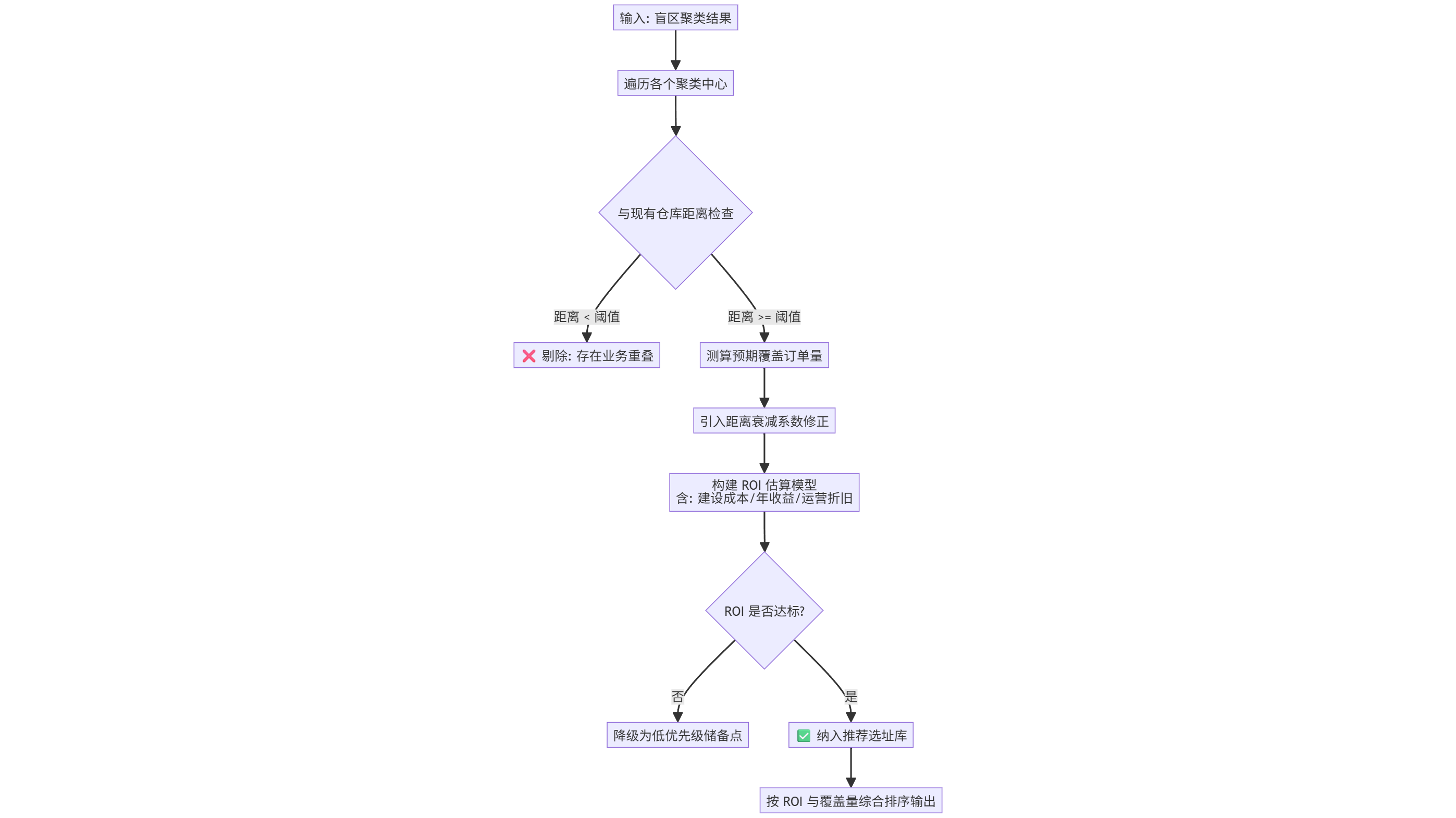 系统并没有把选址变成一个纯数学问题,而是引入了"ROI(投资回报率)"作为一票否决权。一个离现有仓库太近的聚类中心,即使订单再多,也会因为内部左右手互搏而被系统否决。