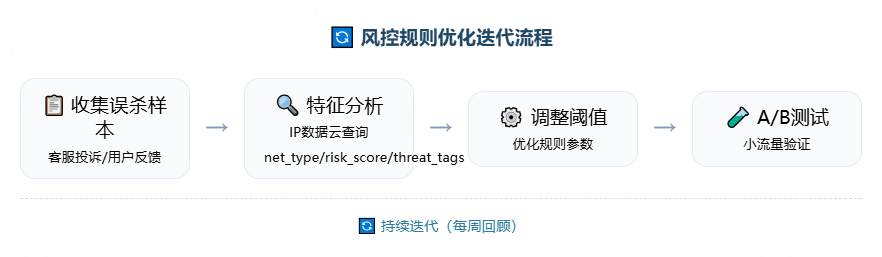 - 收集误杀样本:从客服投诉、用户反馈中标记被误杀的用户IP