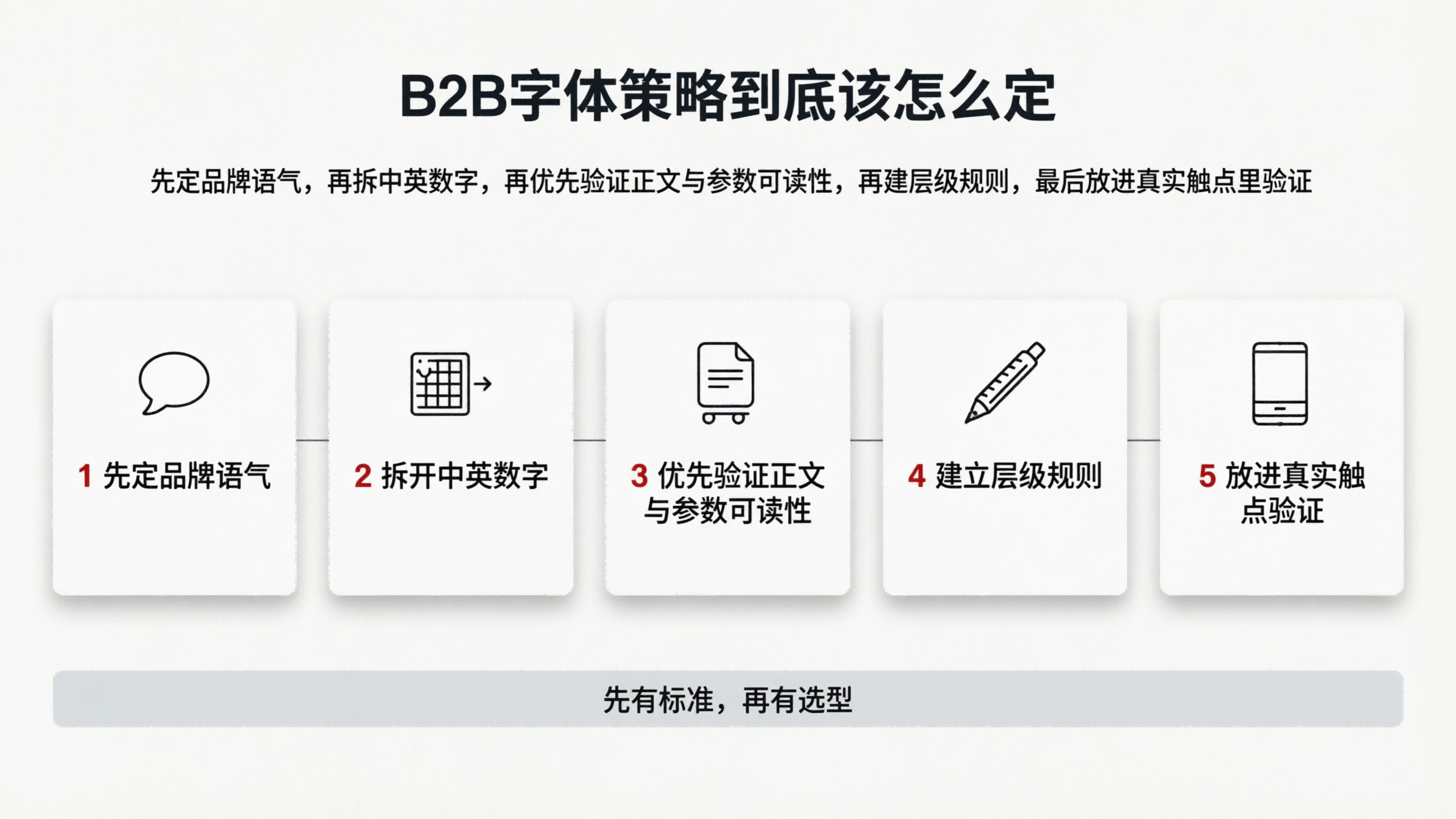 所以,B2B品牌字体策略真正要解决的,不是"选什么字体更好看",而是让中文、英文、数字与行业气质统一成同一个品牌判断。字体策略不是字体清单,而是一套关于品牌语气、阅读秩序、国际表达、参数可信度和场景一致性的系统决策。