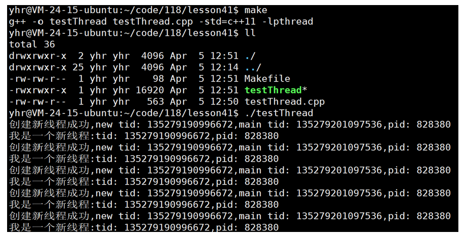 printf("创建新线程成功,new tid: %lu,main tid: %lu,pid: %d\n",tid,pthread_self(),getpid());