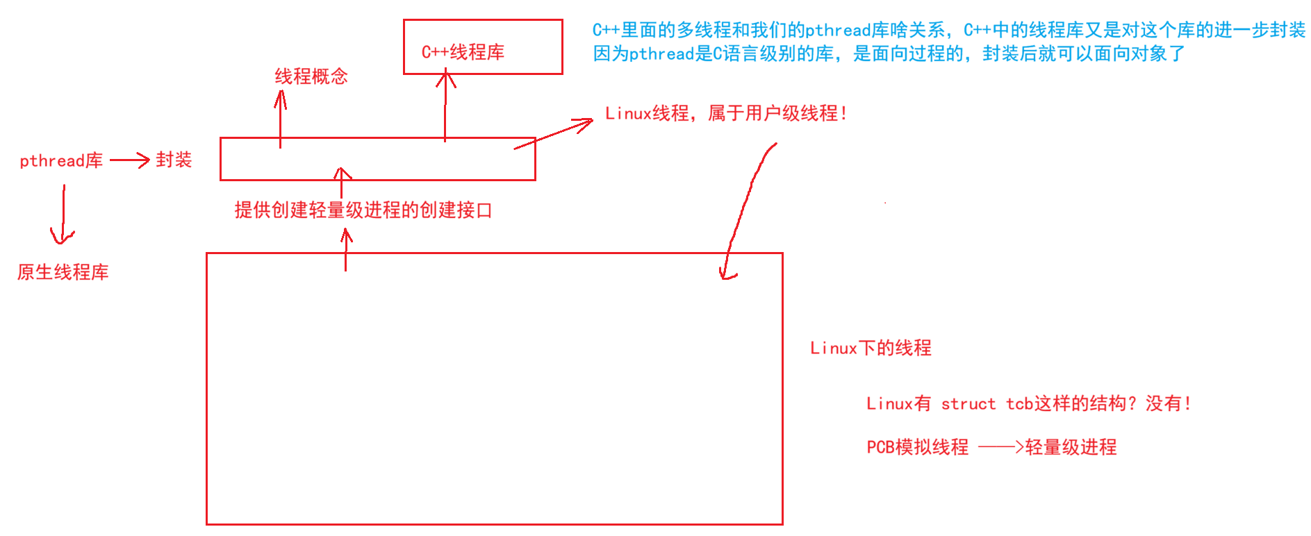 Linux 内核仅提供轻量级进程的创建能力,我们日常使用的线程接口,都来自POSIX 标准的 pthread 线程库 ,所有接口都以pthread_ 开头,编译时必须通过**-lpthread**链接线程库