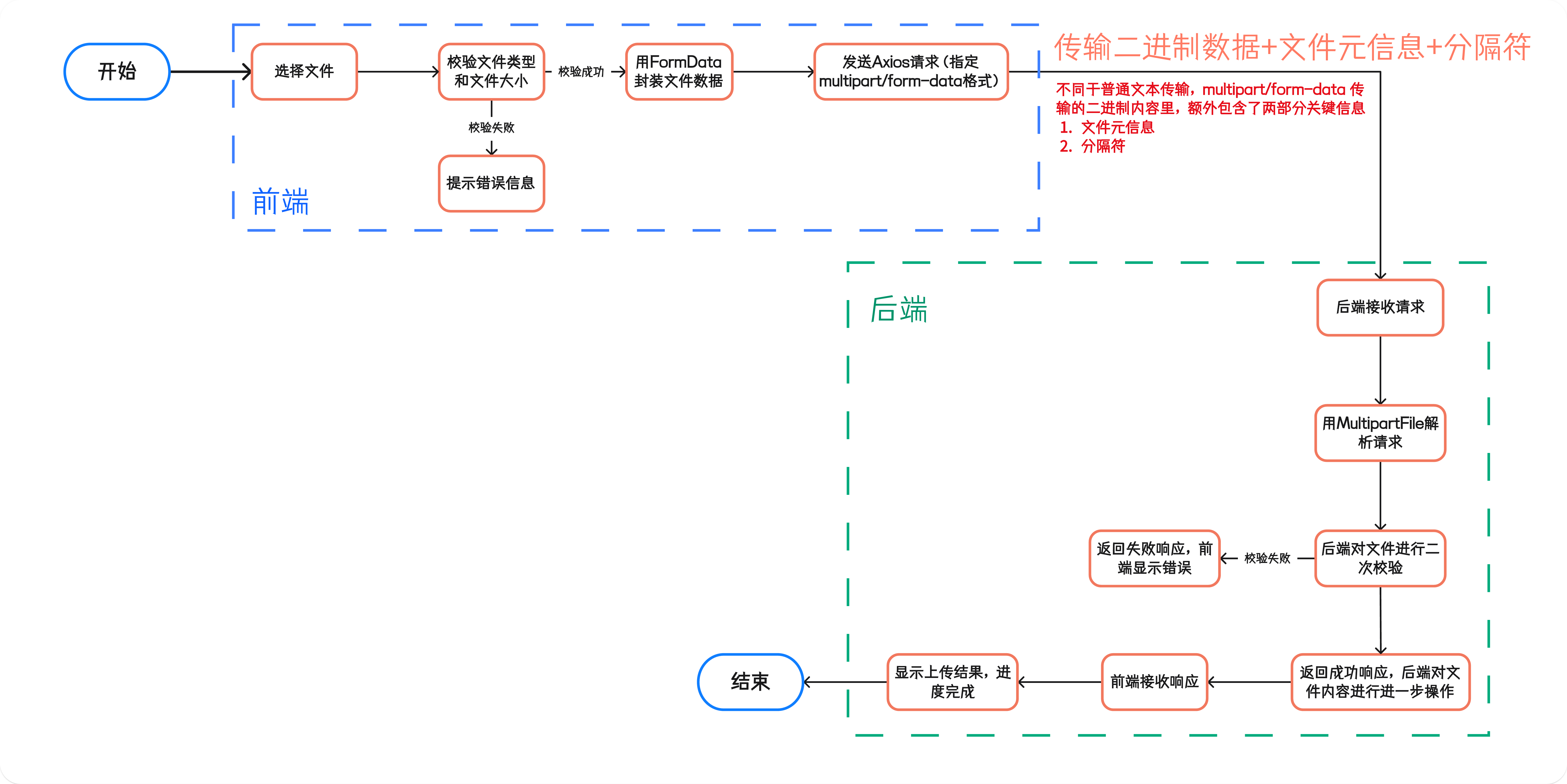 - 用 FormData API 把文件打包成符合 multipart/form-data 格式的请求体