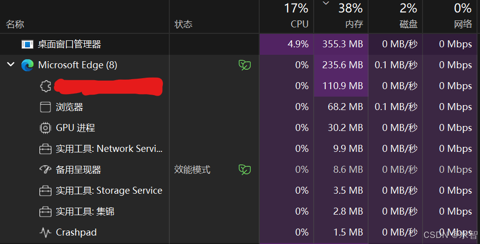 实用工具、Storage Service、广告拦截等,全是 Edge 的后台扩展、渲染残留、系统服务在占内存。