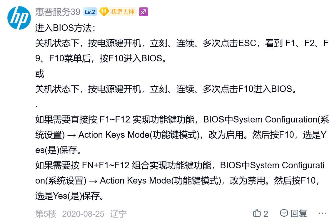 简单来说,就是关机状态下,按开机,然后立刻多次点按f10键,会进入电脑的BIOS模式。然后左右移动到"配置"任务栏下,选择"功能键模式",按回车将它禁用。再按f10保存更改并退出。