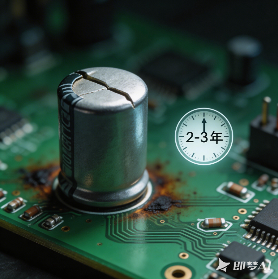 电解电容的作用是保证各个芯片能得到稳定的电流。但它有个致命的缺点:普通电解电容的额定寿命一般是 2000-5000 小时,换算成年的话,也就是 2-3 年左右。