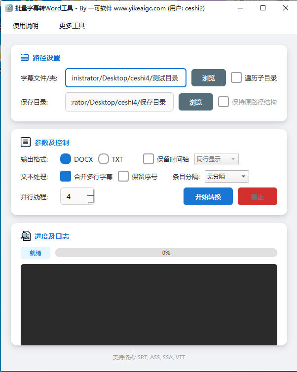 【批量SRT转Word工具】用于将字幕文件批量转换为 Word 文档(DOCX)或纯文本(TXT),并提供时间轴、序号、多行合并等常用输出选项。适合课程台词整理、字幕审校、内容提炼、文稿归档等场景。
