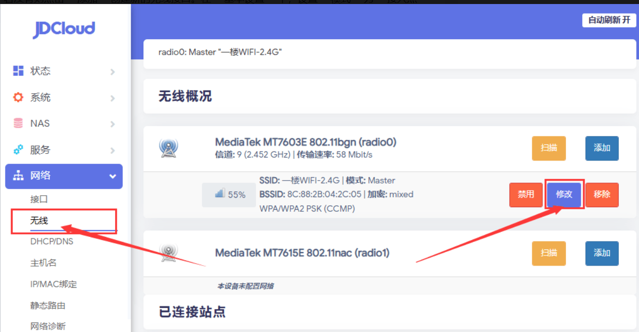 点击 "网络"-"无线",进入无线设置页面。若已有无线配置,点击对应无线接口的 "Edit" 进行编辑;若没有则点击 "添加" 创建新的无线接口。在 "基本设置" 中,设置 "模式" 为 "接入点 AP",设置 "ESSID" 为你想要的无线网络名称,即手机或其他设备搜索到的 WiFi 名称。选择 "频段" 和 "信道",一般默认自动选择,也可根据周围无线网络环境手动选择较少干扰的频段和信道。