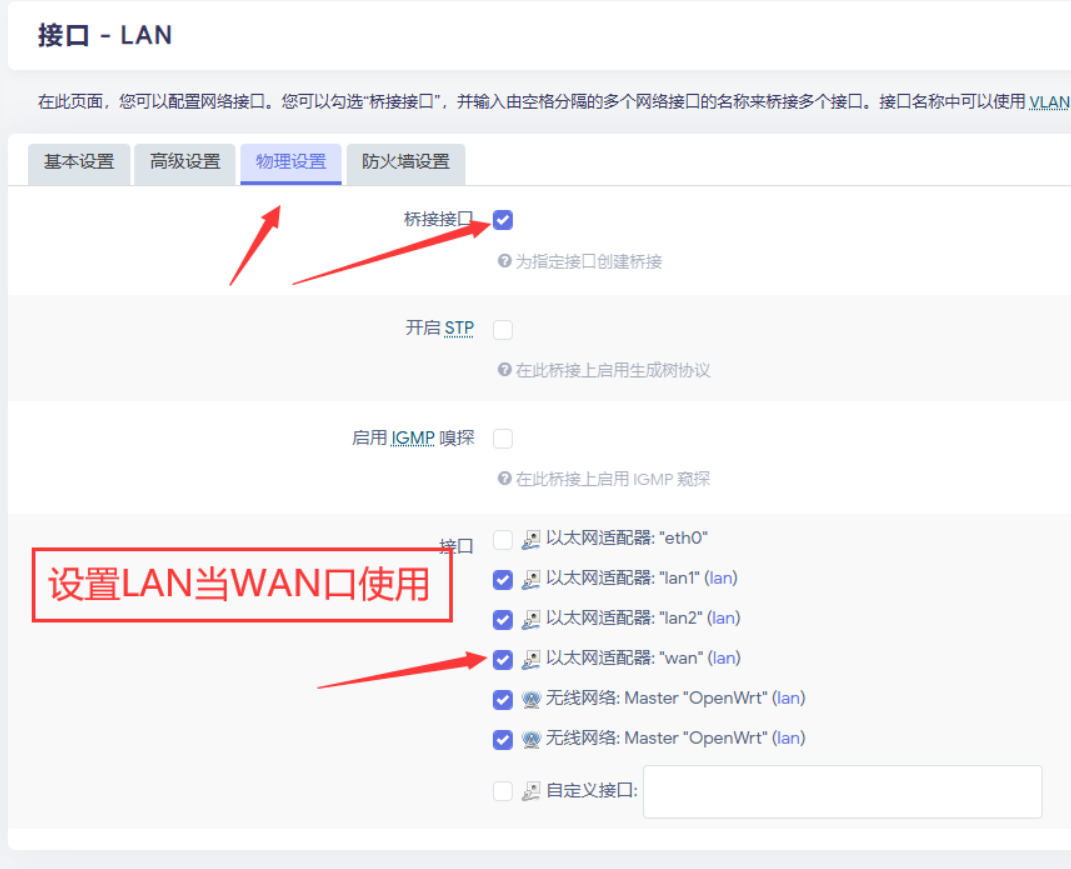 点击 "网络"-"接口",进入接口设置页面。找到 "LAN" 接口并点击 "修改"。在 "物理设置" 中,可根据实际需求设置 LAN 口的 IP 地址、子网掩码、网关和 DNS 服务器等信息。通常情况下,保持默认设置即可。若要与现有网络在同一网段,需将 IP 地址设置为与上级路由器 LAN 口 IP 在同一网段且不冲突的地址。设置完成后点击 "保存",然后点击 "保存并应用"。