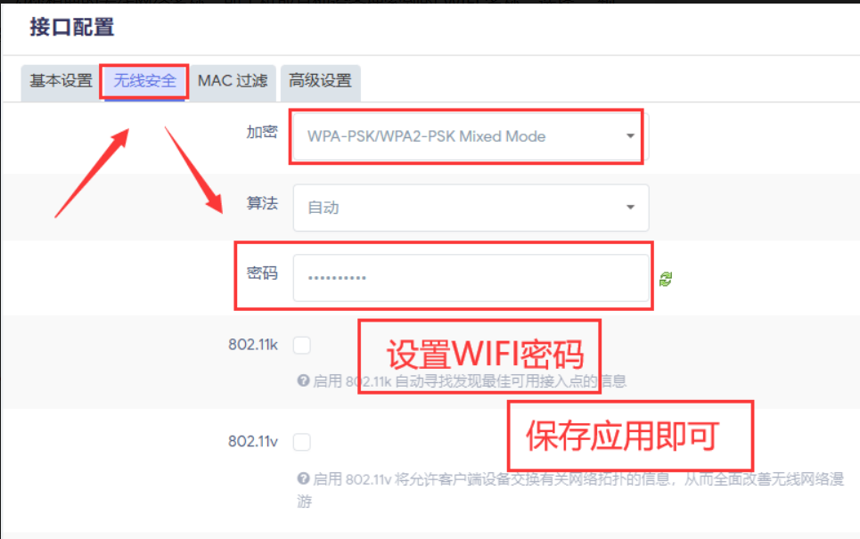 在 "无线安全" 选项中,选择加密方式并设置密码,以保护无线网络安全,如选择 "WPA2-PSK" 加密方式并输入至少 8 位的密码。设置完成后点击 "保存",然后点击 "保存并应用"。