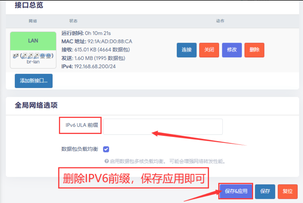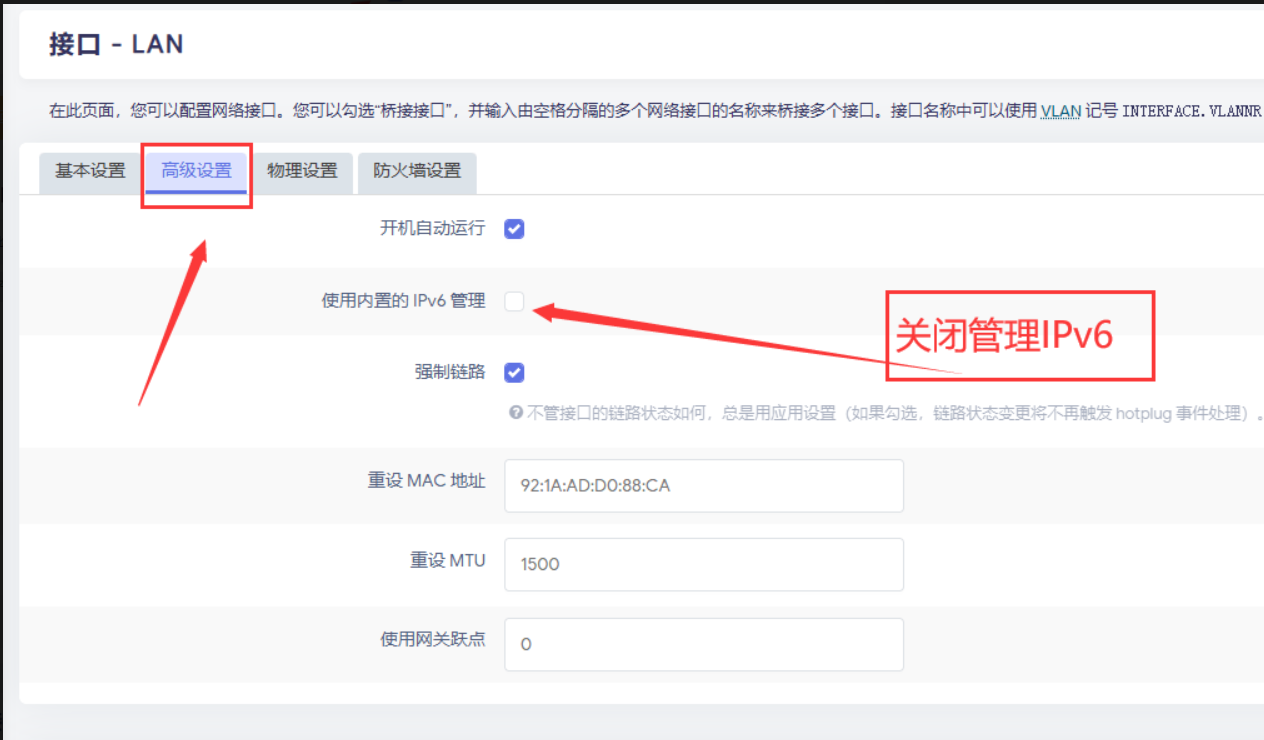根据以上设置会出现一个问题,局域网冲突,直接把协议改为了【DHCP 客户端】其余的不用修改,把高级设置里面的【使用内置的 IPv6 管理】取消掉,保存应用即可。