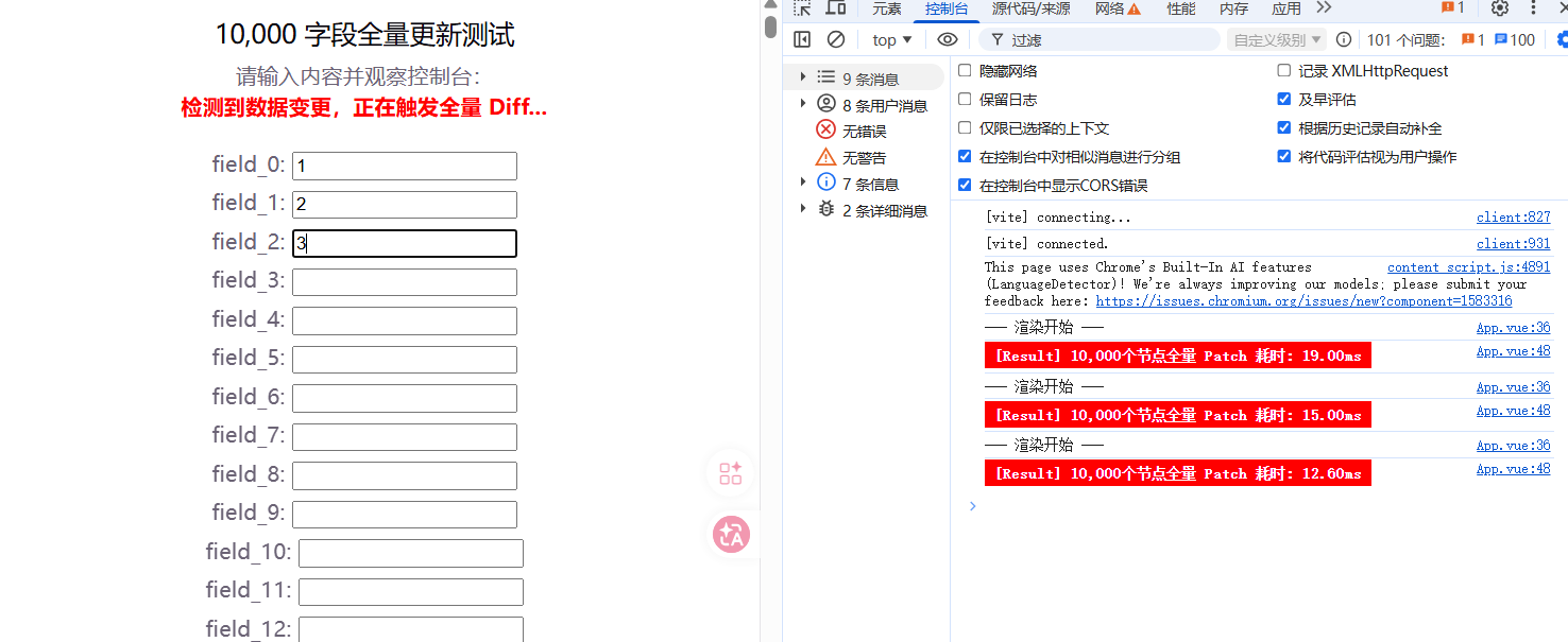 `%c[Result] 10,000个节点全量 Patch 耗时: ${duration}ms`,