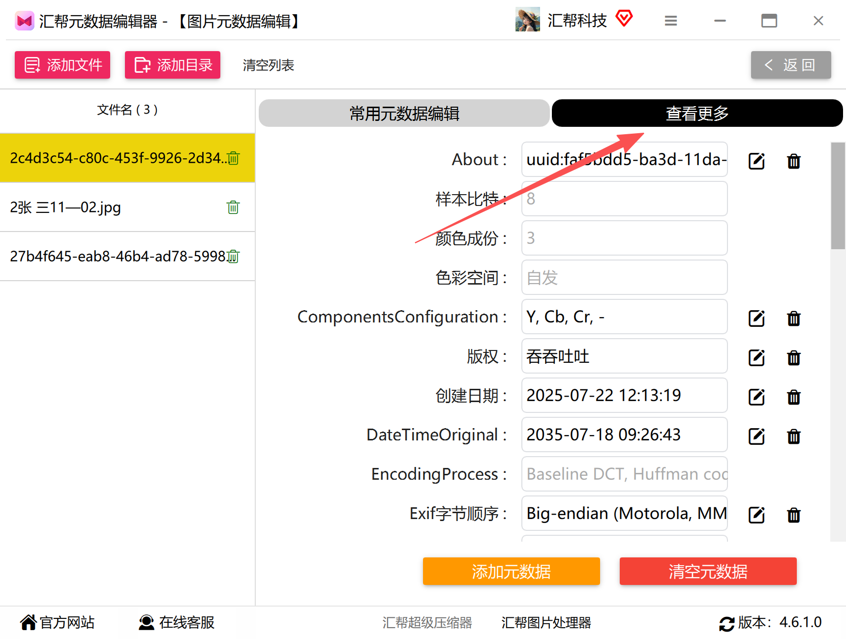 如果只是偶尔需要批量修改照片元数据,且不想接触代码,"汇帮元数据编辑器"绝对是最优选择。该软件界面简洁、操作直观,支持所有常见图片格式(JPG、PNG、RAW等),批量导入、批量修改、批量应用,全程鼠标操作,不用专业技巧,几分钟就能完成。