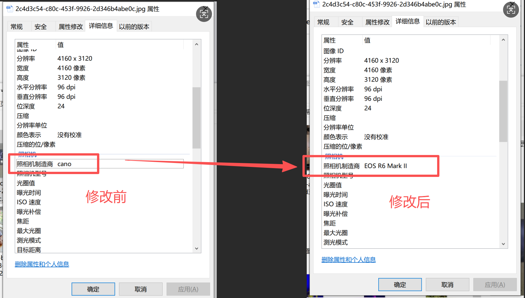 步骤5:核对修改结果。修改完成后,找到任意一张照片,右键点击选择「属性」,在「详细信息」中查看相机型号,确认修改成功即可。如果有个别照片修改失败,可重新导入该照片,重复步骤4即可。