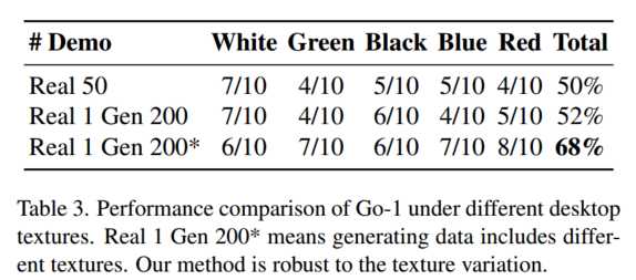 通过第一帧编辑编辑视频,比如更改背景纹理。表3显示了图4所示的不同桌面纹理下的性能,并表明我们的方法可以生成具有不同纹理的演示,以提高策略的鲁棒性。