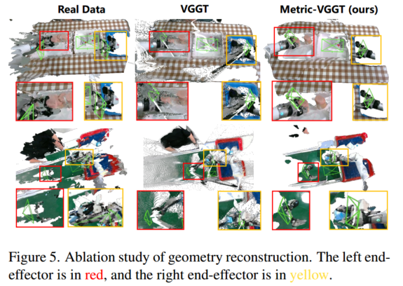 我们的模型预测了机器人场景中最干净的点云和最准确的相机姿态,而现实世界的数据受到相机姿态不准确的影响,VGGT重建包含大量的杂波和噪声。