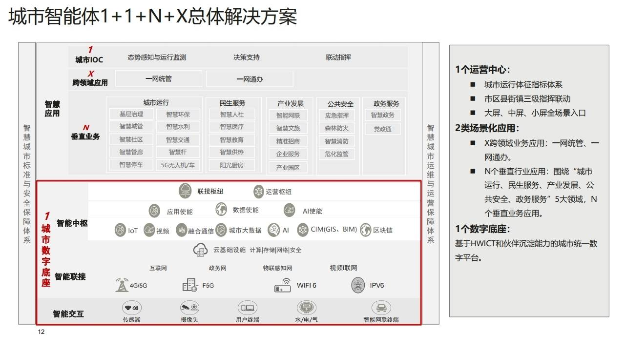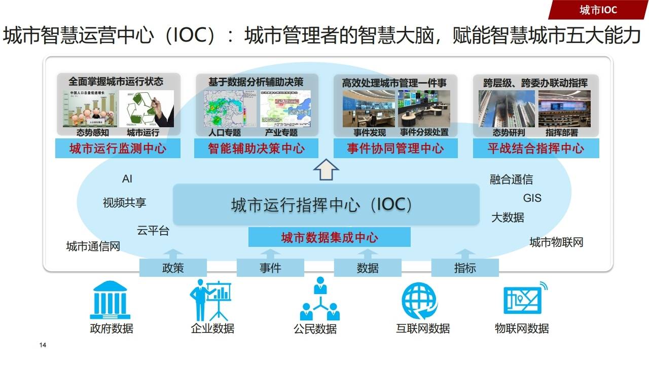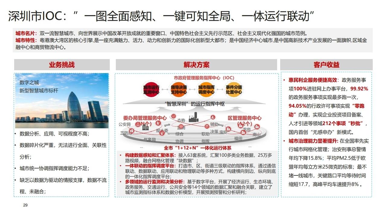 - 架构:市政府管理服务指挥中心(IOC)作为运行指挥中枢,构建全市"1+12+N"一体化运行体系。