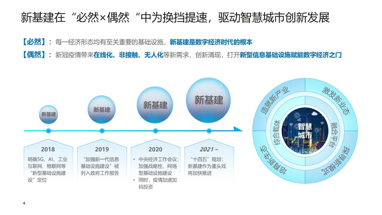 新基建在"必然"(数字经济时代的根本)与"偶然"(新冠疫情带来的非接触、无人化需求)的双重驱动下,正加速智慧城市换挡提速,造就新产业,激发新业态。
