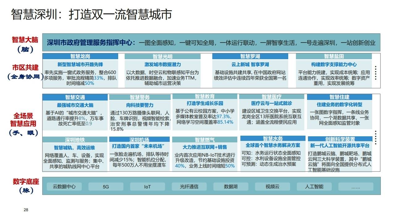 - 方案:打造"物联、数联、智联"三位一体的智能普惠城区,建立统一感知决策系统。
