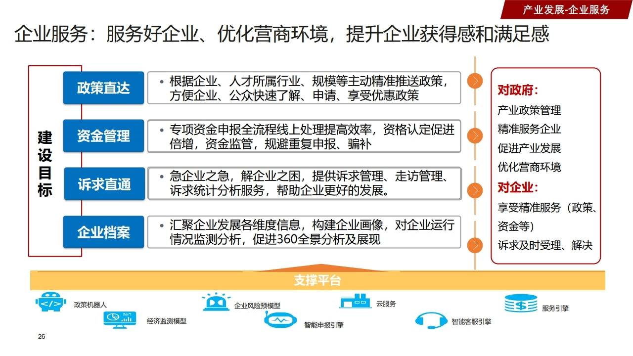 - 企业服务:政策直达、资金管理、诉求直通,构建营商环境精准监测与优化体系。