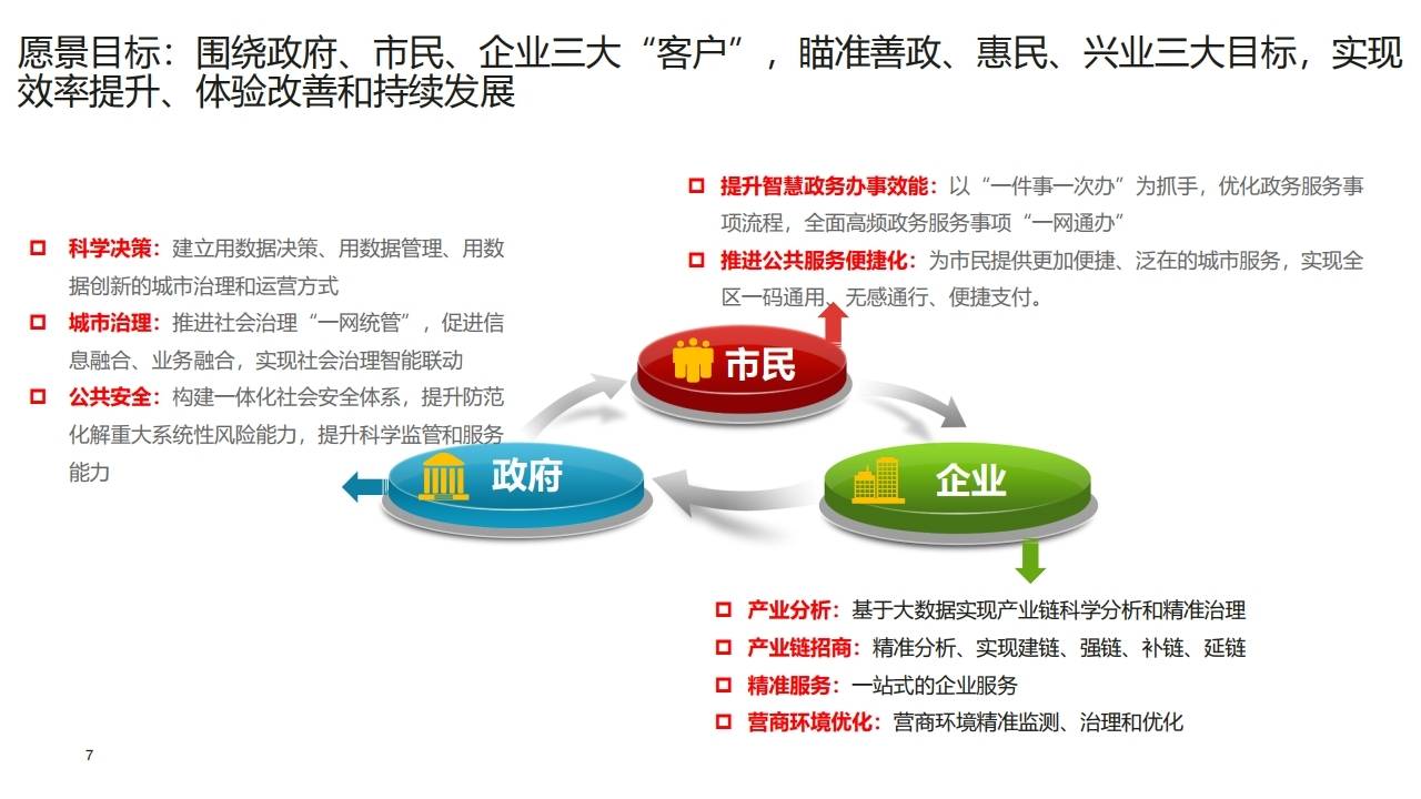 愿景目标:围绕政府、市民、企业三大"客户",瞄准善政(效率提升)、惠民(体验改善)、兴业(持续发展)三大目标。