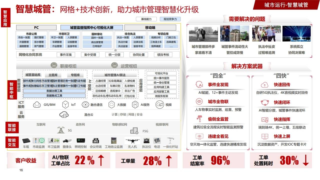 - 方案:网格+技术创新,利用AI赋能12+事件主动发现,自研5G执法仪实现4K音视频实时回传。