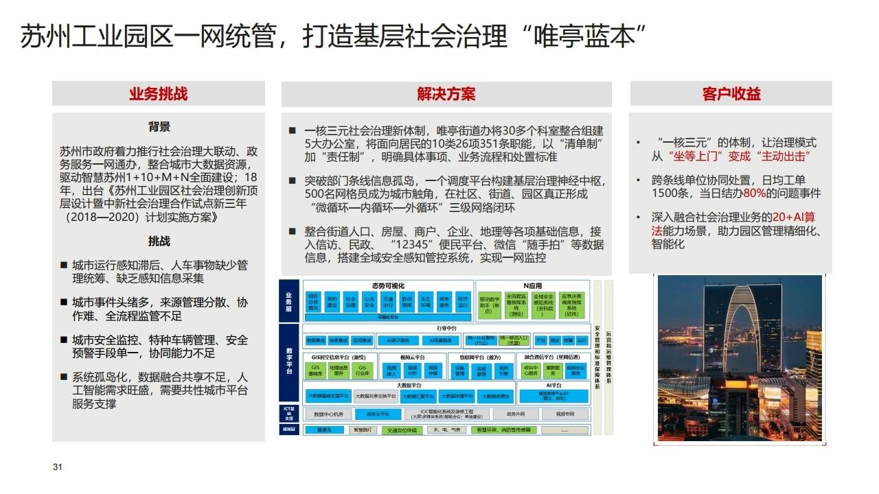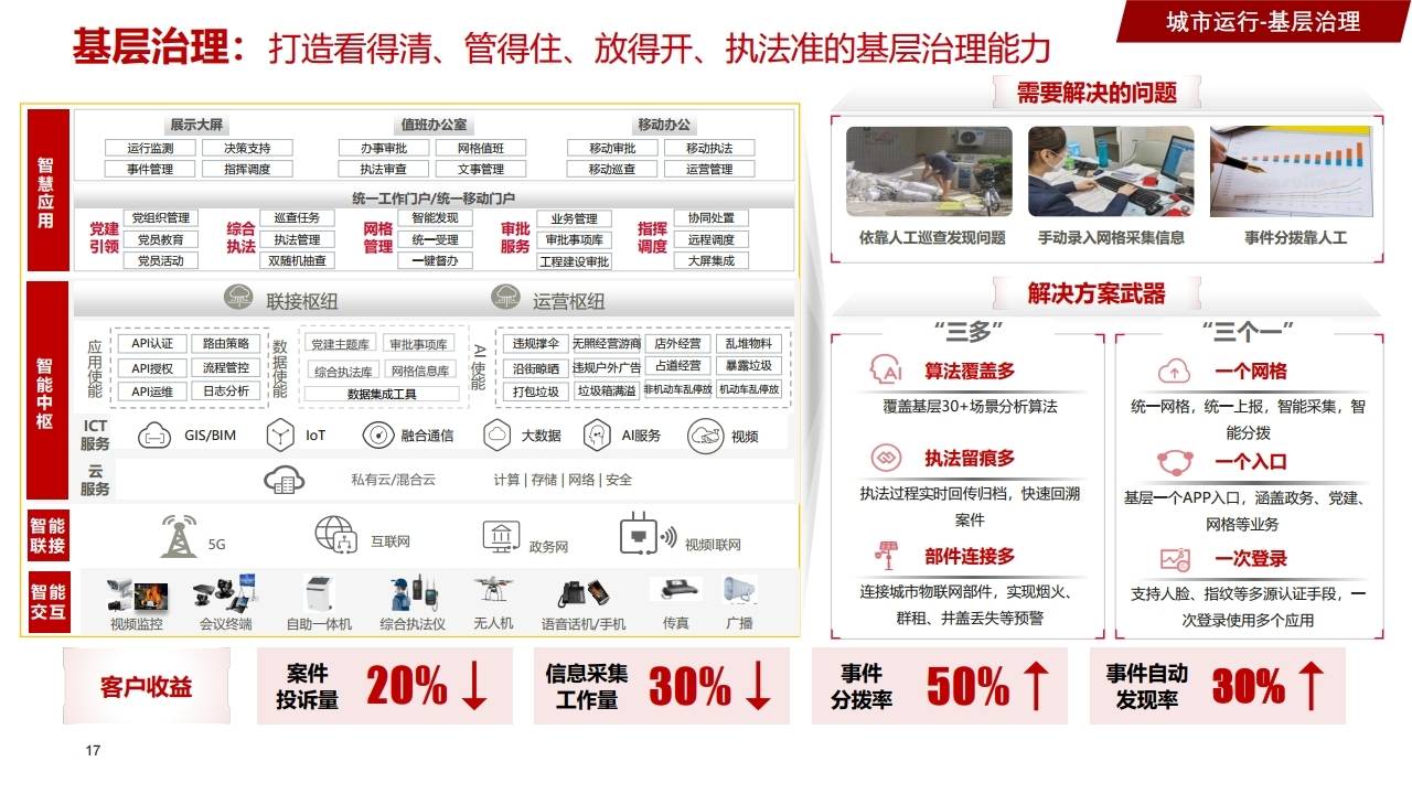 - 方案:算法覆盖多场景,统一网格上报,智能分拨;基层一个APP入口,涵盖政务、党建、执法等业务。