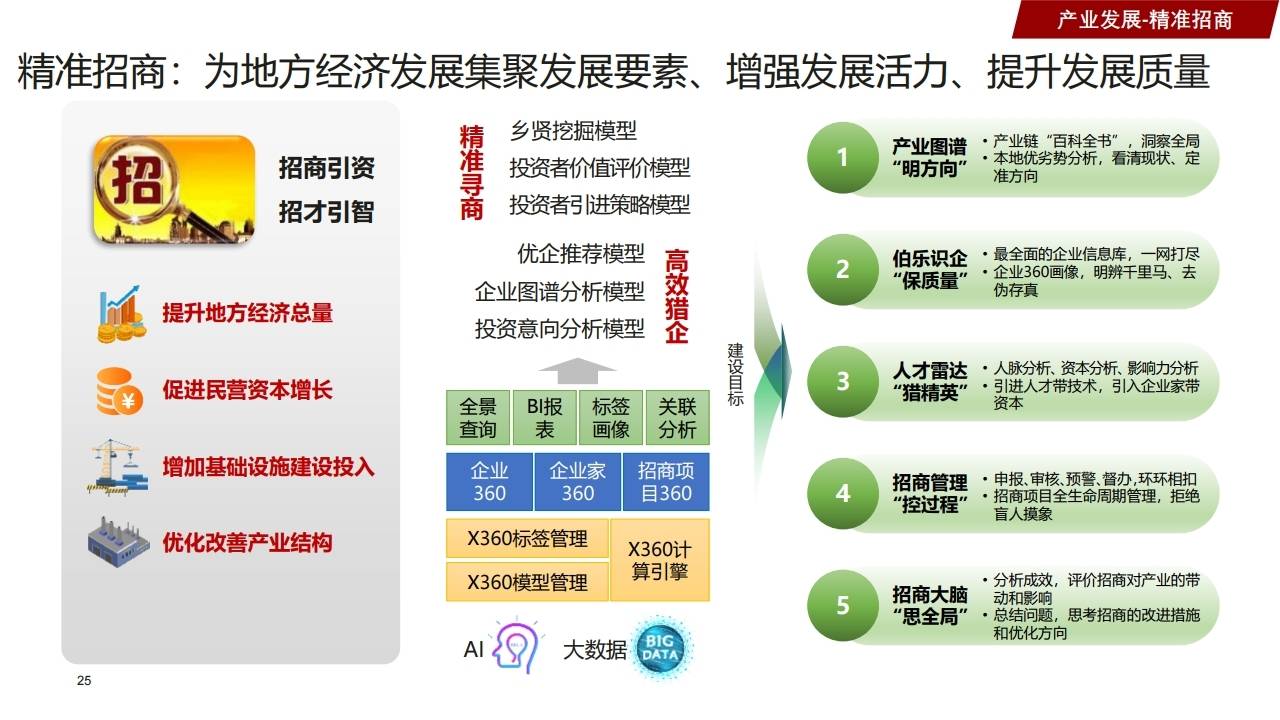 - 精准招商:利用产业图谱、企业360画像、人脉资本分析,实现伯乐识企、人才雷达。
