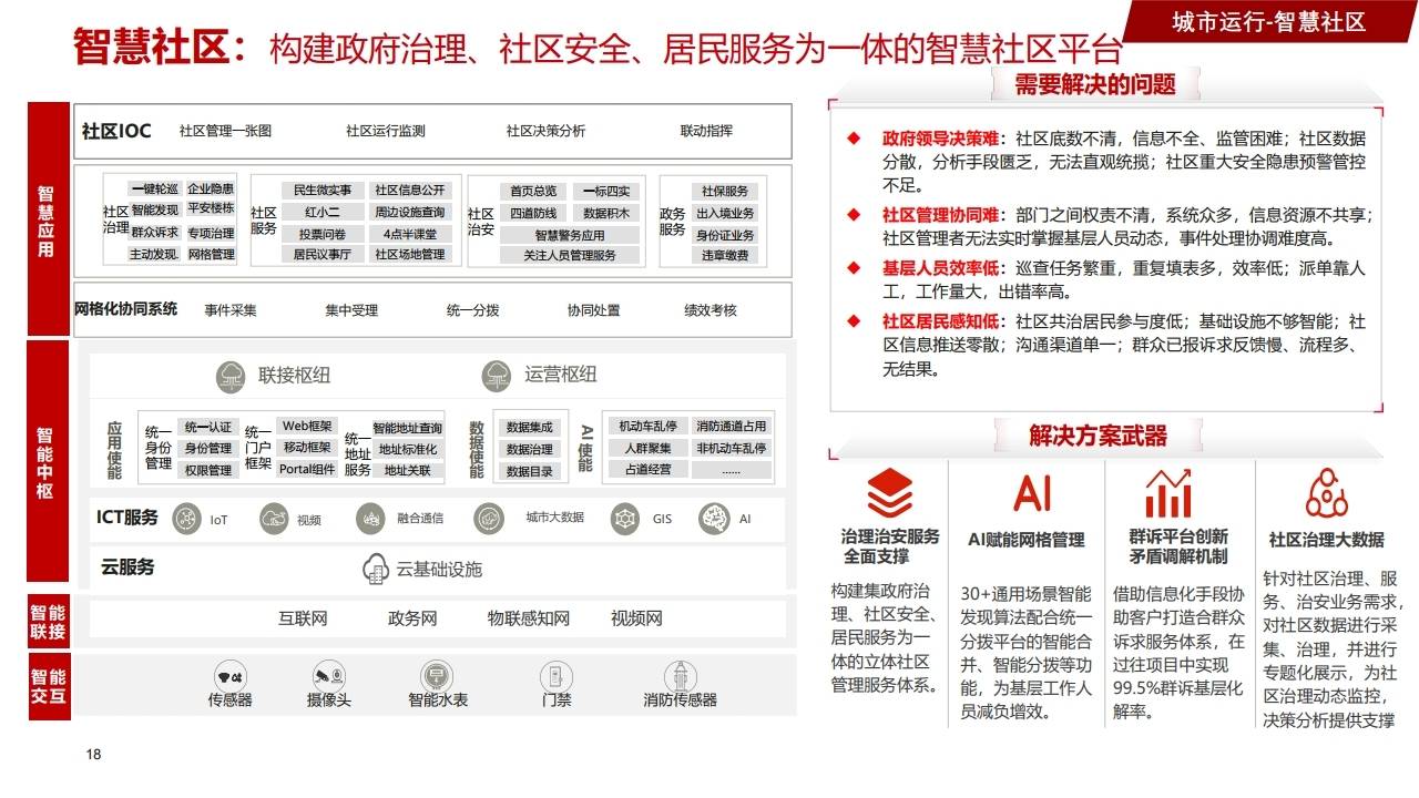 - 社区治理:解决安防隐患多、服务感知差问题,需全方位监控、网格化治理。