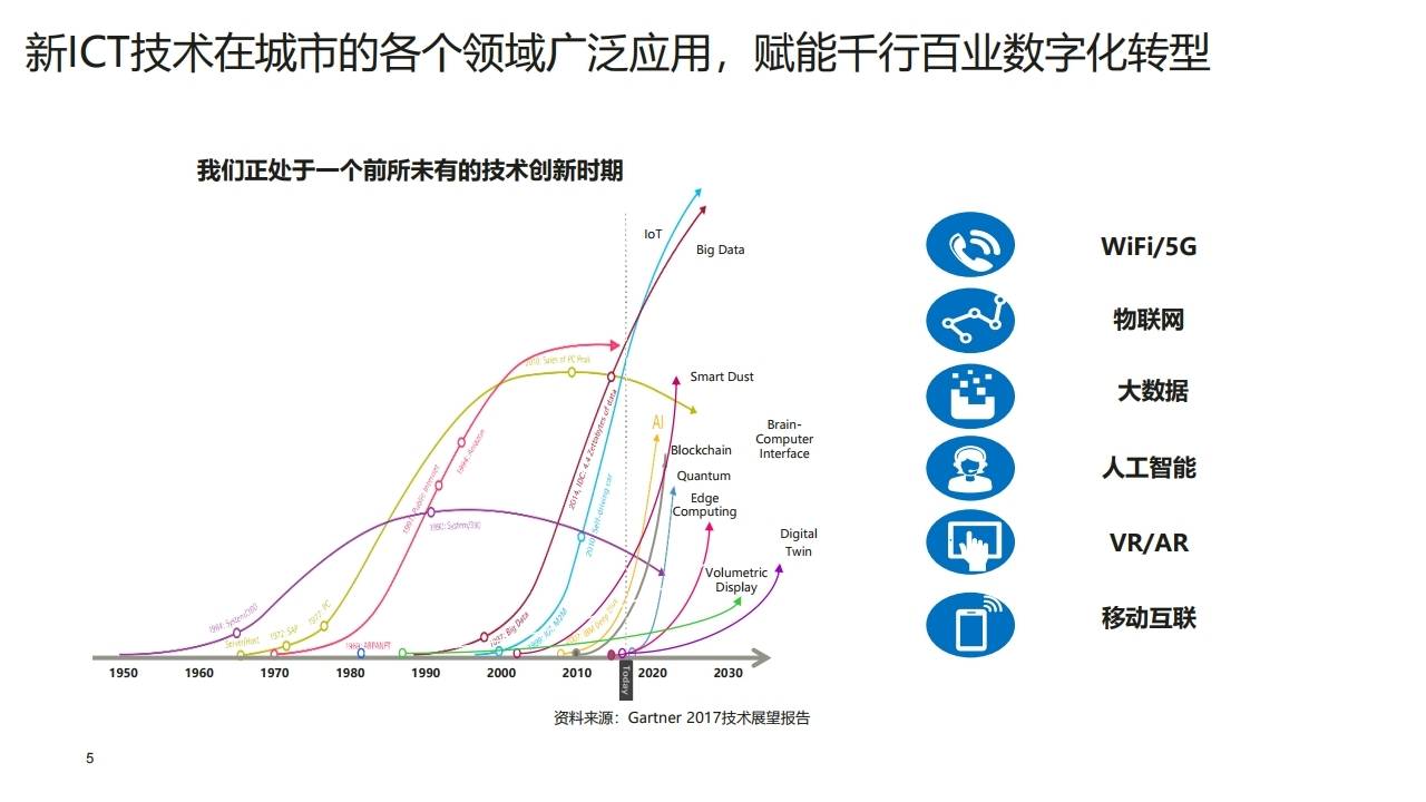 技术驱动:我们正处于技术创新的爆发期,IoT、5G、大数据、AI、区块链、边缘计算等新ICT技术在城市各领域广泛应用,赋能千行百业数字化转型。