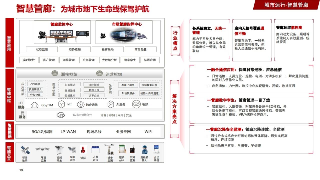 - 方案:管廊数字孪生,全3D模拟,结合分布式感应光纤监测沉降。