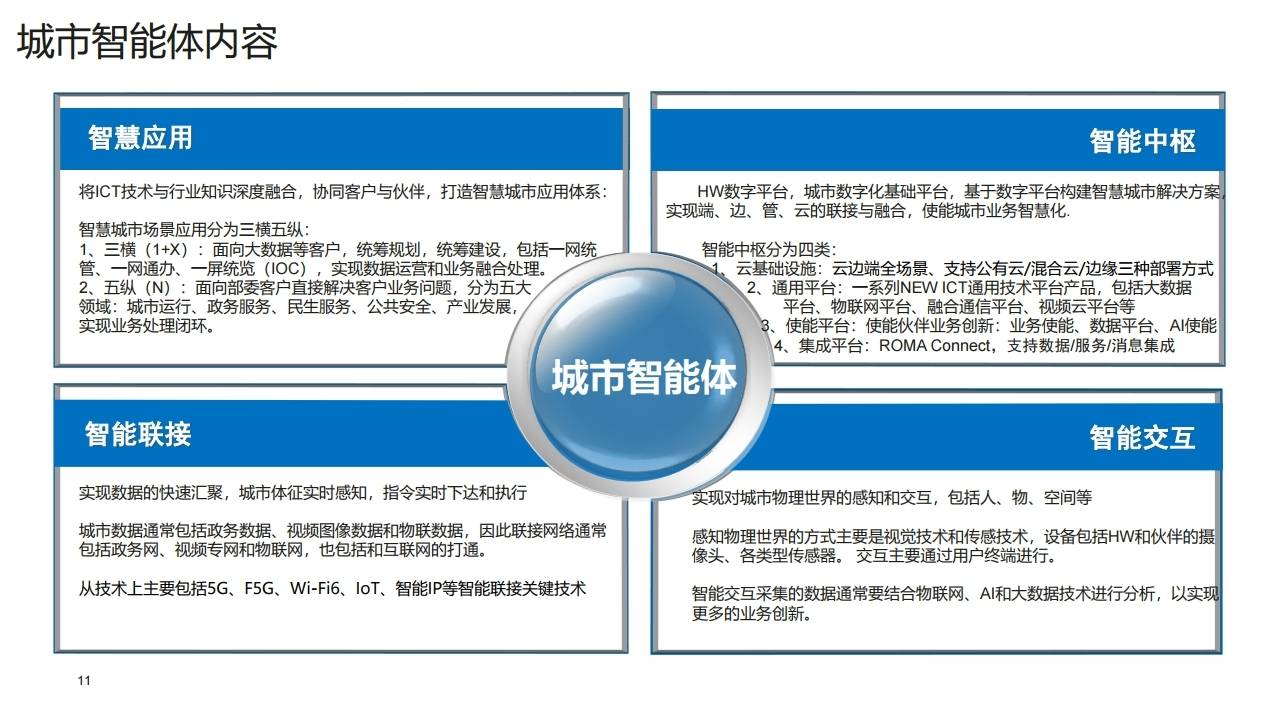 - 1个数字底座:基于HW ICT和伙伴能力的城市统一数字平台,包括云基础设施、智能联接(5G/F5G/Wi-Fi 6)、智能交互(传感器/摄像头)。