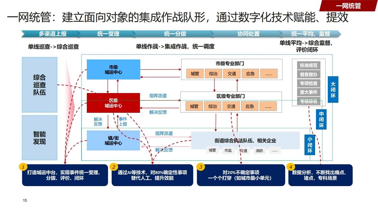 - 流程:多渠道上报 -> 统一受理 -> 统一分拨 -> 协同处置 -> 统一监督。