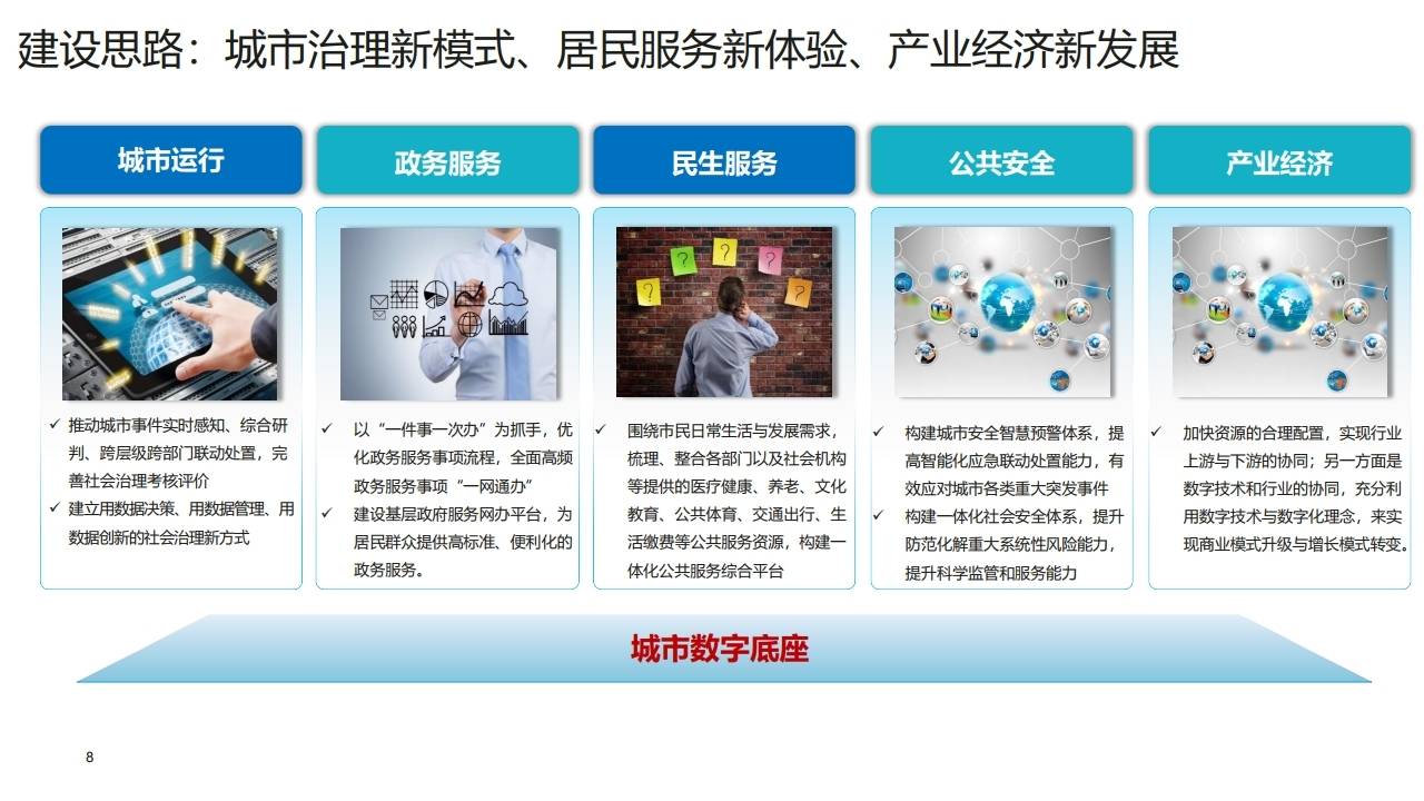 建设思路:推动城市事件实时感知与跨层级联动,优化政务服务流程,加快资源合理配置,构建一体化公共服务平台与安全预警体系。