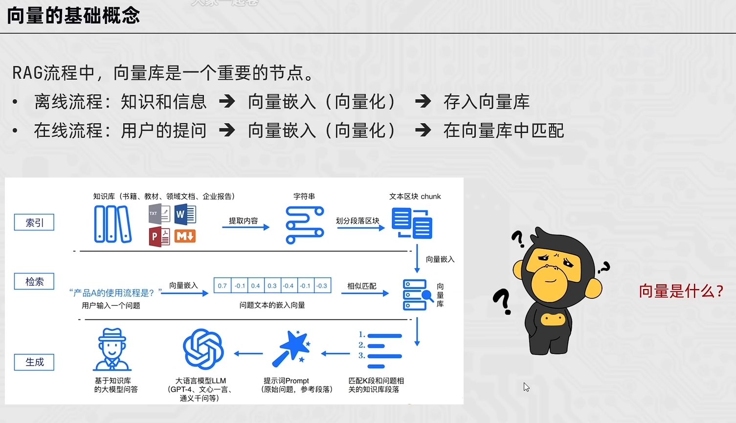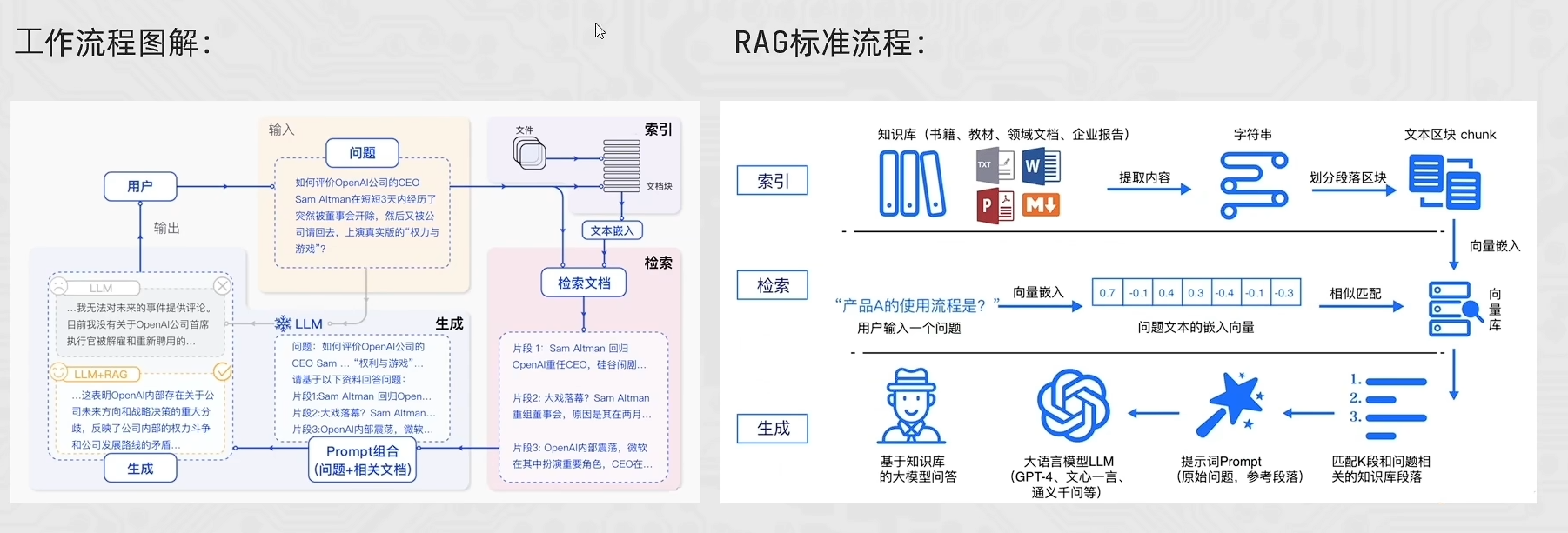 第一步提取新的信息并生成对应的文本嵌入。第二步根据提问生成内容嵌入,然后将内容嵌入与文本嵌入进行比对,找到相关信息。第三步就是拼接问题与相关知识,打包给大模型进行提问。